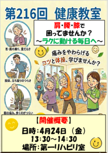 整形外科、耳鼻咽喉科の診療だけでなく、充実したリハビリ施設とスタッフ数を活用して、デイケア(通所リハビリテーション)や、健康寿命の延伸を目指すメディカルフィットネス、健康教室も開催しております。お気軽にご参加ください。