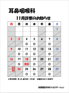 耳鼻咽喉科11月診察のお知らせ|尼崎市の整形外科|武部整形外科リハビリテーション|耳鼻咽喉科、デイケア